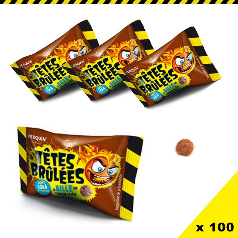 Le bonbon tête brûlée cola qui te secoue la tête ! Délicieuse bille originale au goût cola enrobée d'acide.