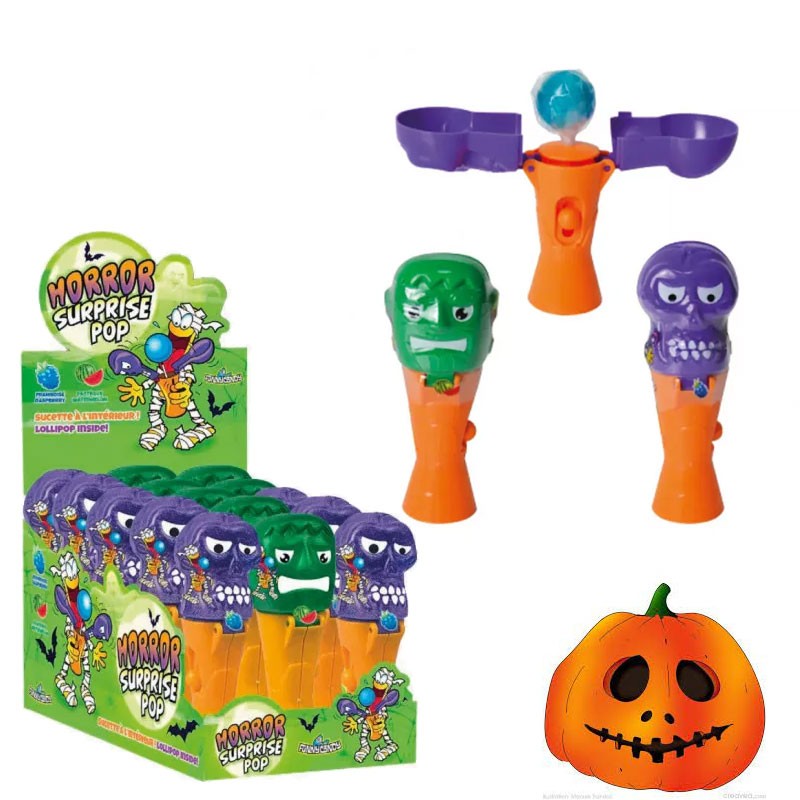 La tête du personnage s'ouvre en deux quand on appuie sur le bouton et laisse apparaître une sucette framboise ou pastèque.