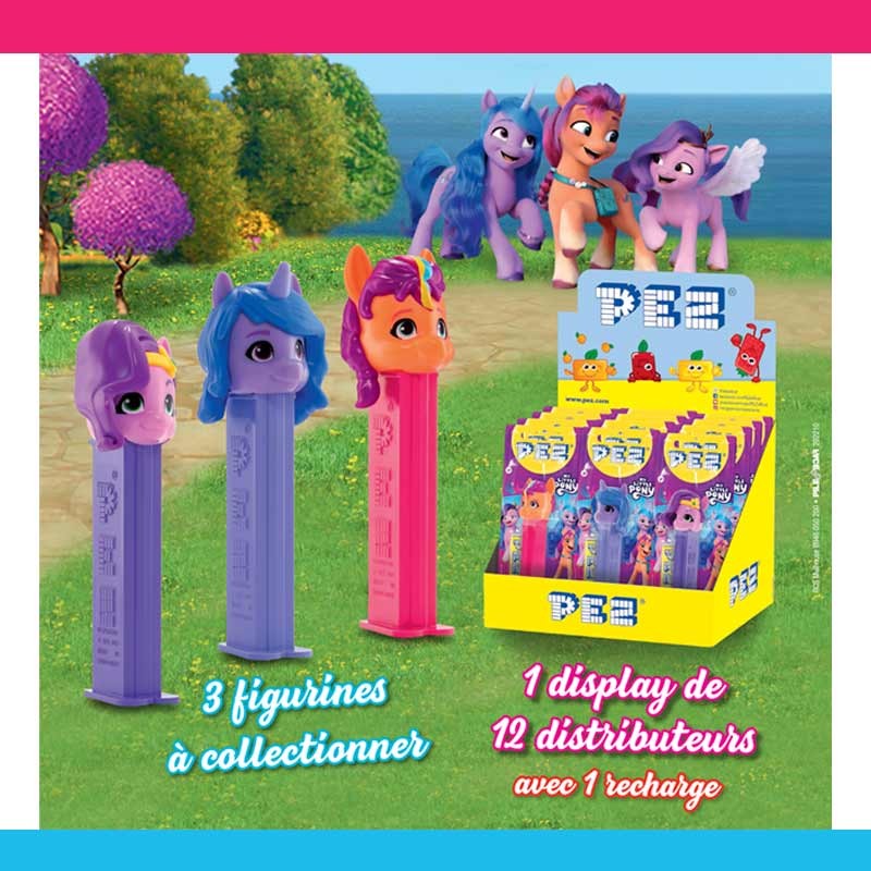 Distributeur de poche PEZ little Poney, avec 1 recharge de 12 bonbons aux goûts fruits.