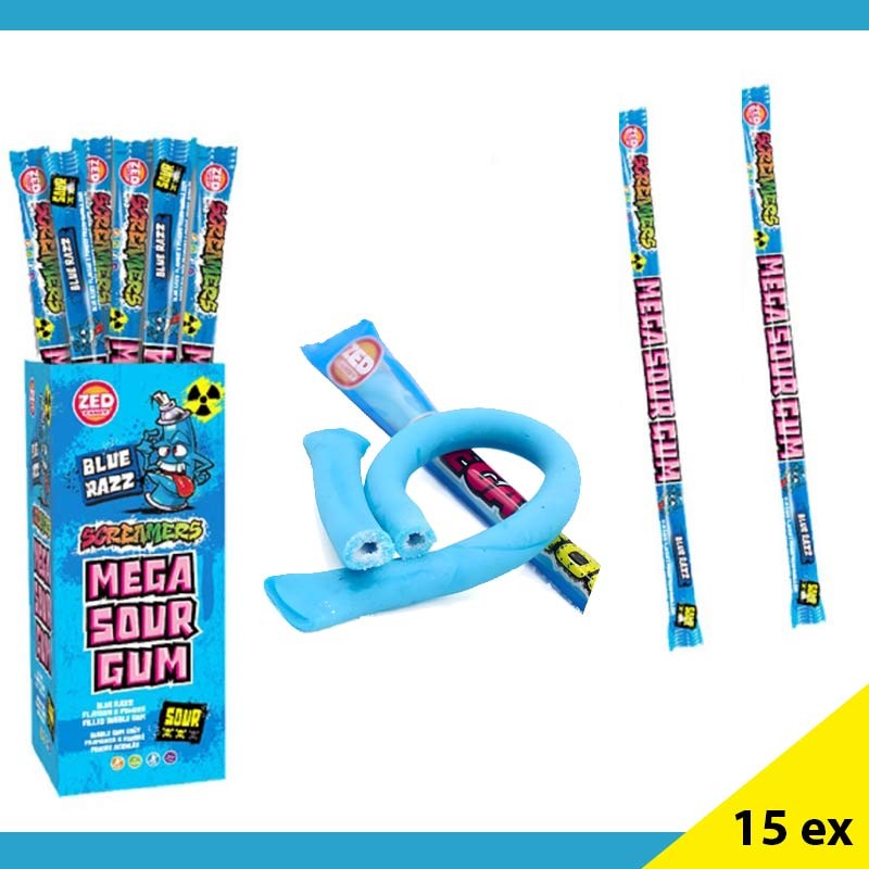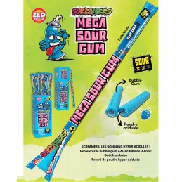 La marque de bonbons hyper acidulés SCREAMERS frappe fort avec MEGA SOUR GUM. Ce bubble gum XXL en tube de 30cm t'offre un goût framboise explosif.